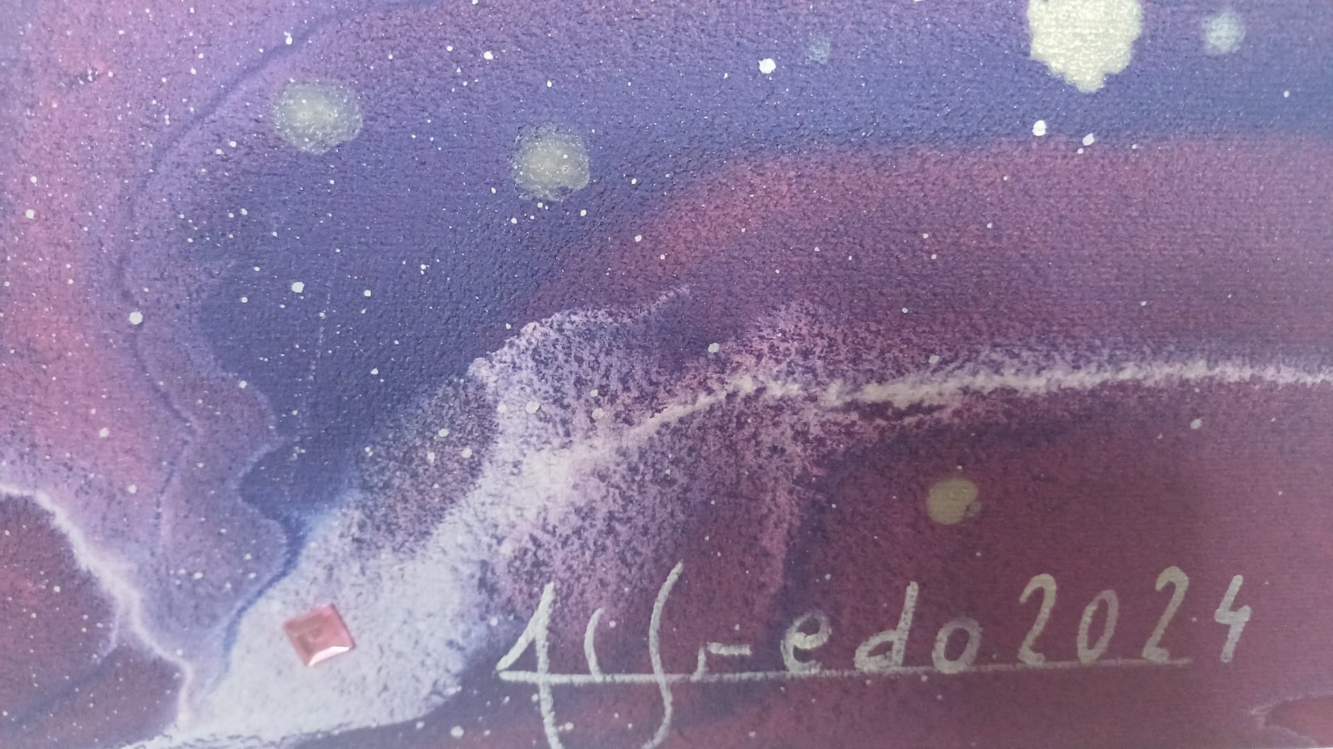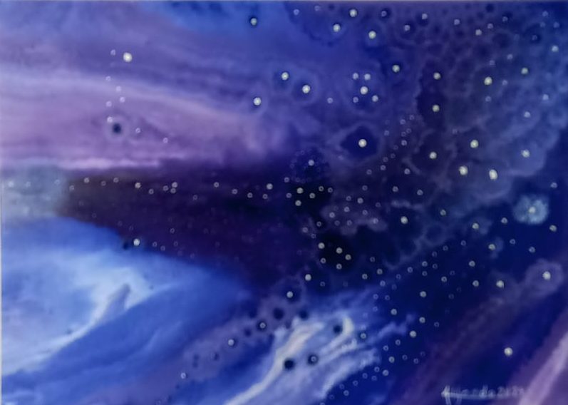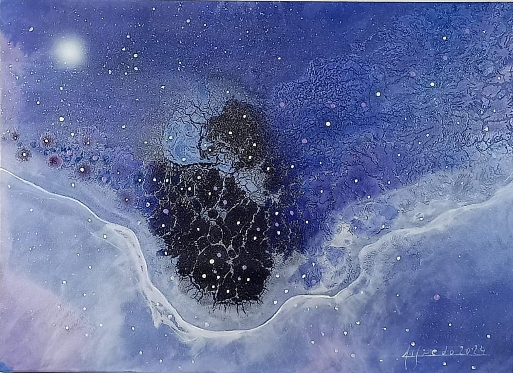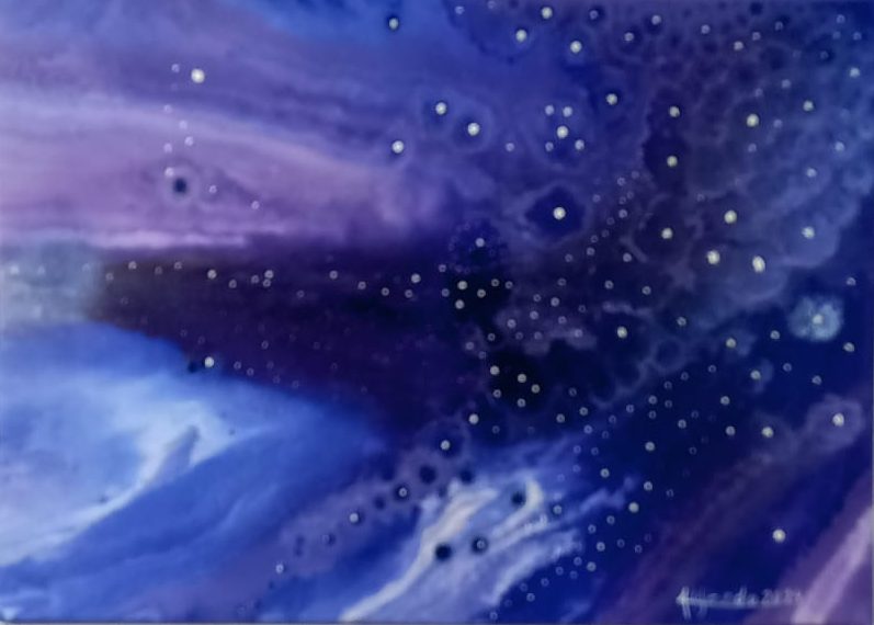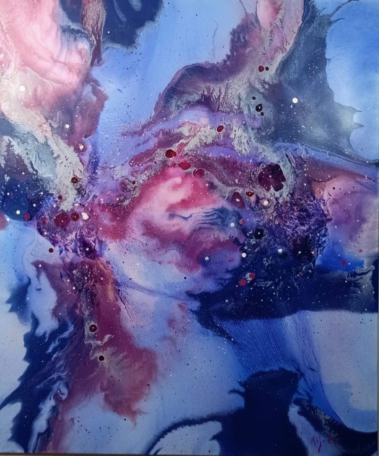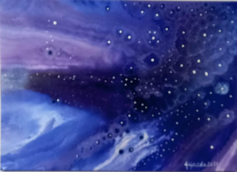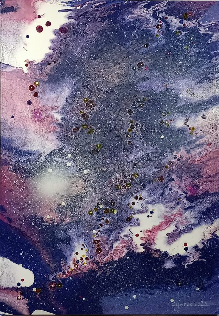 «Esta colección reúne 18 cuadros en los que predominan los tonos azul, blanco y rosado, entrelazándose en composiciones que evocan formas espaciales y atmósferas etéreas.»