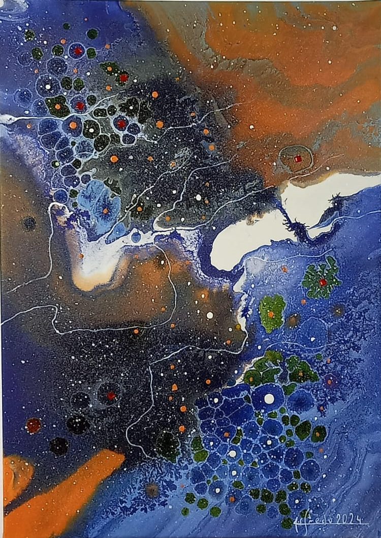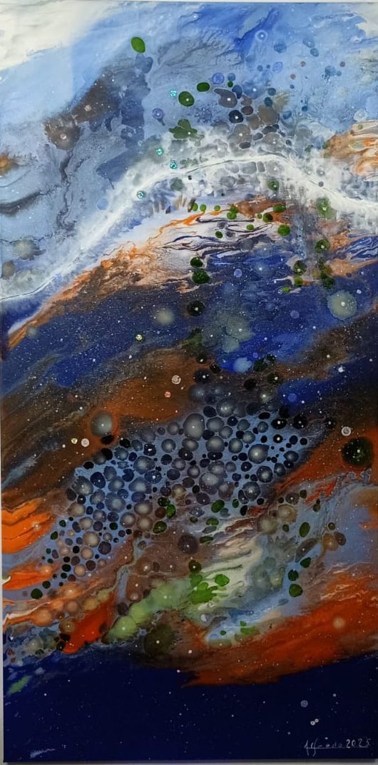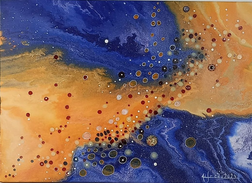 Esta colección está compuesta por cuatro obras que dialogan entre el azul y el naranja, fusionando contrastes en un lenguaje abstracto. Cada cuadro es un universo visual donde la serenidad del azul se encuentra con la energía del naranja, creando armonías inesperadas y emociones vibrantes.